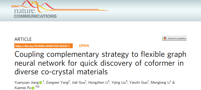 --化学与生物信息学实验室蒲雪梅教授在Nature Communications杂志上在线发表了论文:Coupling complementary strategy to flexible graph neural network for quick discovery of coformer in diverse co-crystal materials,开发了一种普适性强准确度高的深度机器学习的共晶筛选模型,该模型可灵活应用于多种领域的共晶预测(药物、有机功能以及含能材料等),大幅提升了机器学习对共晶虚拟筛选的泛化能力和准确度,其构建策略可为深度学习在其它领域的应用提供了参考和指导。
