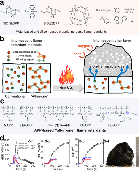 图2. (a)典型有机-无机杂化阻燃剂;(b)传统膨胀阻燃和“三源一体”膨胀阻燃示意图;(c)基于聚磷酸铵(APP)的“三源一体”膨胀阻燃剂;(d)典型“三源一体”膨胀阻燃的成炭、抑热、抑烟效果。