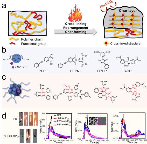 图3. (a)共聚型炭化阻燃方法示意图;典型离聚物、高温自交联/重排阻燃单体(b)及成交联/重排结构(c);(d)典型高温重排阻燃效果。