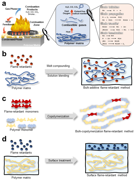 图1. (a) 高分子材料燃烧过程示意图;(b)添加型阻燃方法;(c)共聚型阻燃方法;(d)表面处理阻燃方法。