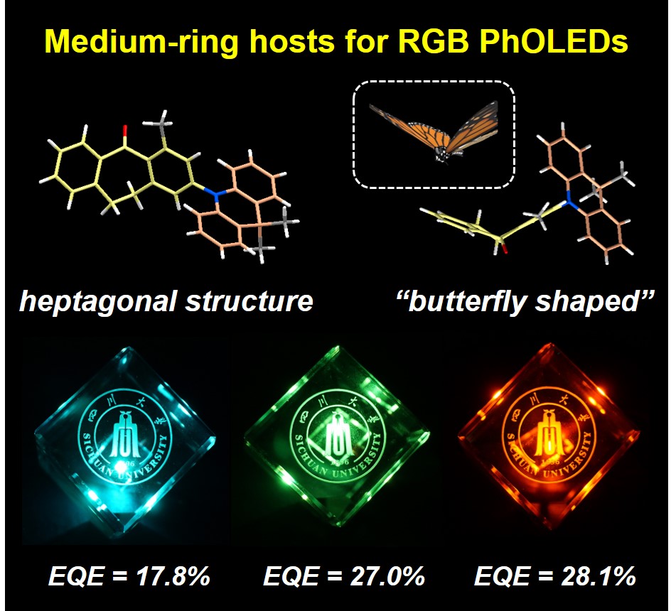 该研究以“Structurally Nontraditional Bipolar Hosts for RGB Phosphorescent OLEDs: Boosted by a “Butterfly-Shaped” Medium-Ring Acceptor”为题目发表在Angewandte Chemie International Edition上,a漫