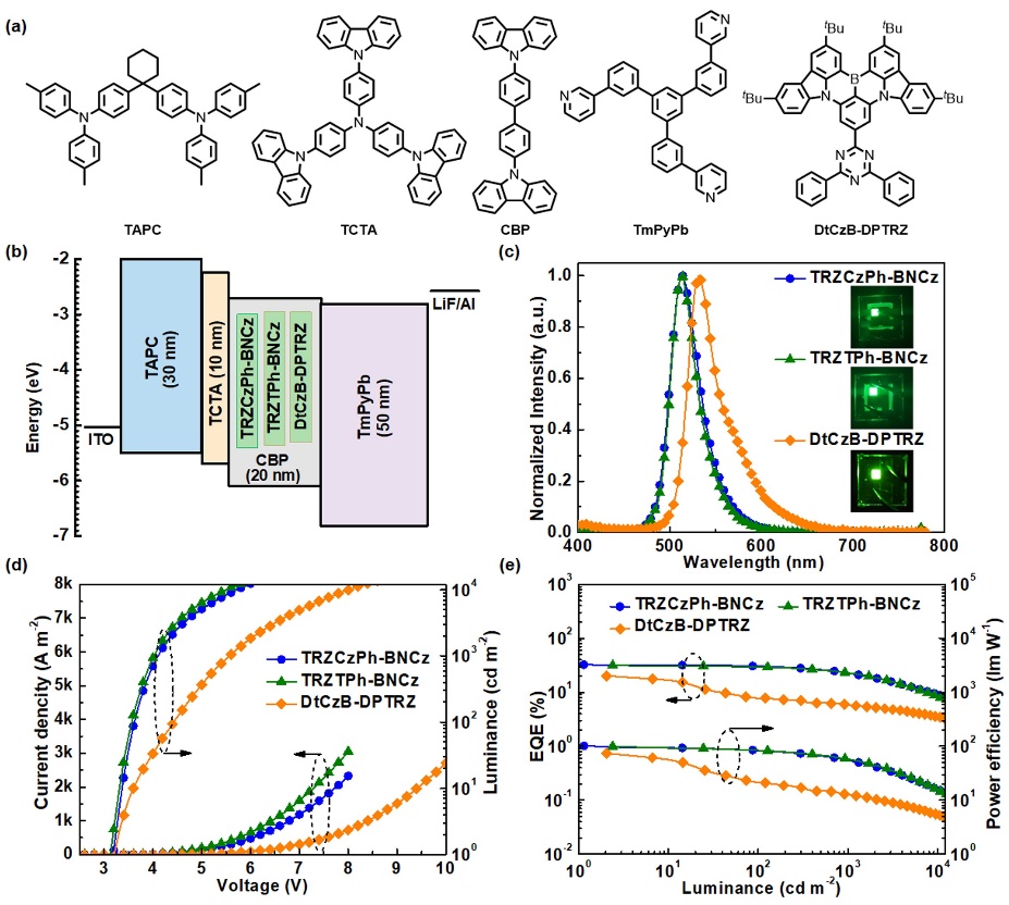 OLED测试结果表明,相比于基于DtCzB-DPTRZ的OLED,由于上转换速率的提高,基于TRZCzPh-BNCz和TRZTPh-BNCz的OLEDs展现出了明显更加优秀的器件性能,实现了32.5%的最大外量子效率、更小的效率滚降(EQE1000 = 22.9%)和更长的器件寿命。这项工作为开发可产业化的高性能MR-TADF分子提供了一个新的分子设计思路。