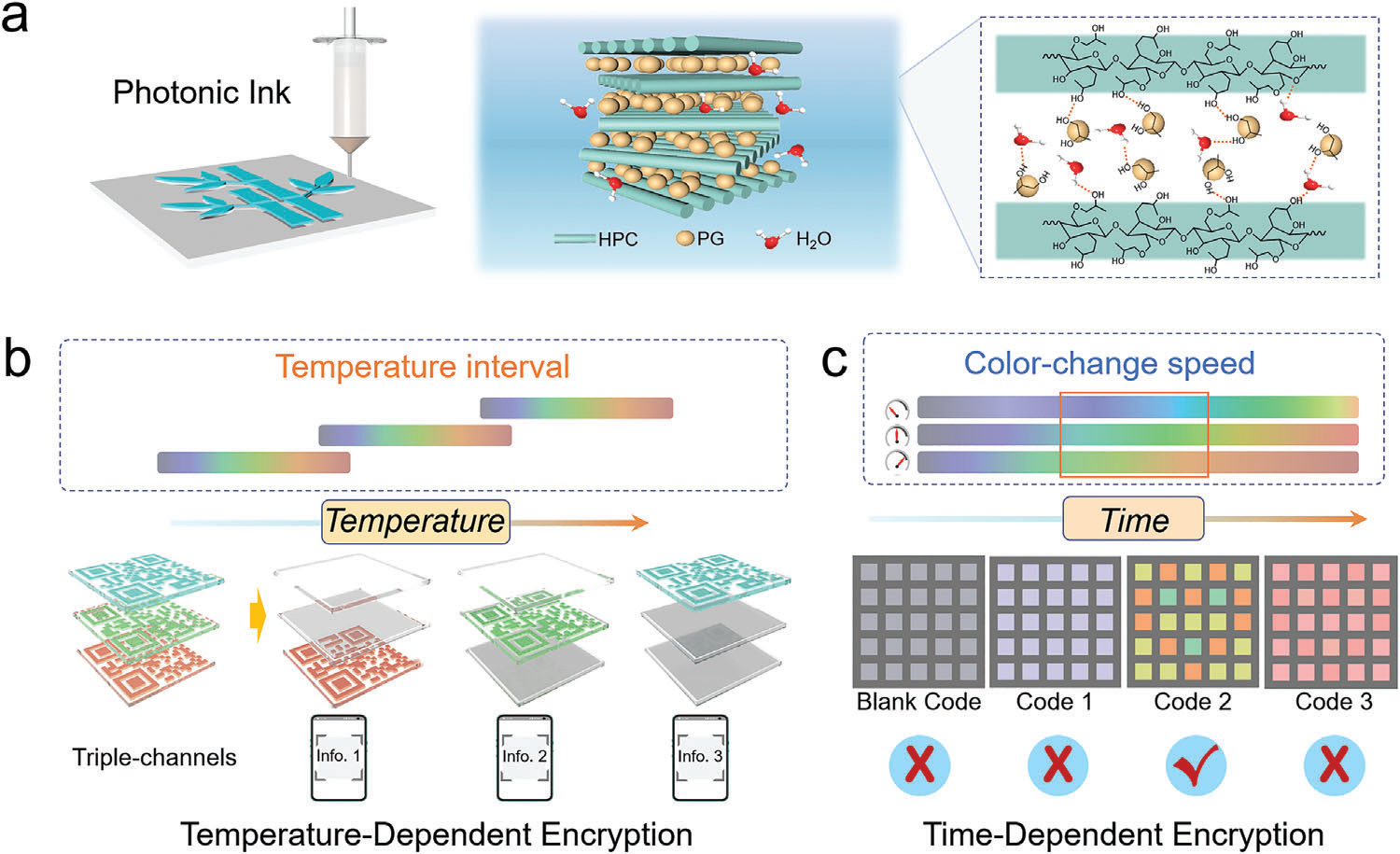 宋飞教授团队报道了具有时间/温度分辨信息加密/解码功能的纤维素光子墨水。复杂的加密信息通过不同结构色转变存储在的多个通道中,并且信息解密仅在指定的温度和时间点获取。该光子墨水可以很容易地加工成各种复杂的图案,凭借高透明度和响应温度范围的可控性,结合先进的多通道编码技术,实现了温度依赖性的多维信息加密。此外,利用响应中的颜色转变速度差异,结合摩斯密码加密方法,实现了时间依赖的多维信息加密。这一发现为光子材料协同温度和时间分辨信息编码和高端防伪技术提供了新思路。