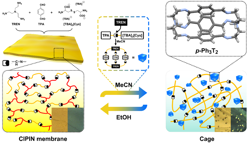 何玲教授和陶国宏教授研究团队首次将胱氨酸离子液体设计到聚亚胺网络中,制备出一种柔性的动态离子聚亚胺膜材料。并基于离子液体可调的反应活性,提出了一种溶剂响应性策略,成功实现无定型离子聚亚胺薄膜和结晶型多孔有机分子笼之间的智能切换,该转换过程是完全可逆且可控的。这主要源于这两种材料都遵循DCvC原理,且共享着相同的单体构建模块,因此可以通过离子液体在乙醇和乙腈溶剂中氨基活性的差异,进而从热力学上控制亚胺键的自适应行为。为了适应溶剂环境的限制,其中的醛和胺组分会进行自我修正,形成热力学稳定产物。研究表明,无序的聚亚胺薄膜在乙腈中可以转换成结晶的有机分子笼,反之,将分子笼晶体置于乙醇中可以再次获得聚亚胺膜。这样膜-笼的相互转换可以不断循环。理论计算结合实验数据表明氨基酸离子液体中α位羧基和氨基间的内氢键效应是离子聚亚胺膜-分子笼可逆可控转换的关键。这项工作在聚合物网络和结晶分子之间建立了一座桥梁,并为智能动态材料提供了参考。