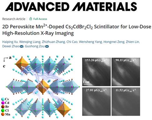 邹国红教授与材料学院赵德威教授合作,在国际学术期刊Advanced Materials在线发表了题为“2D perovskite Mn2+-doped Cs2CdBr2Cl2 scintillator for low-dose high-resolution X-ray imaging”的研究论文。该论文以a漫