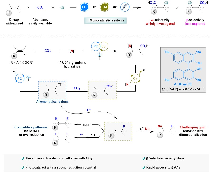针对以上问题,余达刚教授和叶剑衡研究员团队在前期利用可见光促进CO2转化研究(Acc. Chem. Res. 2021, 54, 2518; Nat. Catal. 2021, 4, 304)的基础上,开发了可见光/金属协同催化策略,调控反应选择性,实现了CO2参与的烯烃新转化。该团队通过可见光催化烯烃单电子还原,产生亲核性的自由基阴离子,然后与CO2反应实现β选择性羧基化,再结合铜催化的自由基型C-N偶联反应,首次实现了CO2参与的烯烃氮羧基化反应。该反应的核心在于发展的强还原性的联萘酚光催化剂和铜催化剂之间能够很好兼容,组成高效的可见光/金属协同催化体系。该体系克服了烯烃难单电子还原、自由基中间体易发生过度还原、氢原子转移和自由基二聚等副反应的挑战,为烯烃自由基阴离子的正交官能团化转化提供了新思路。