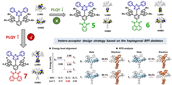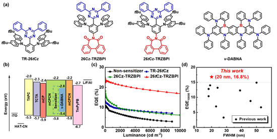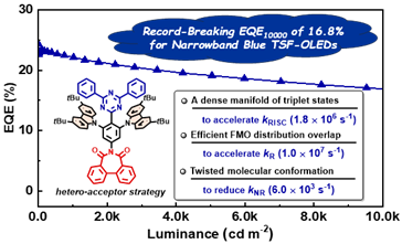 近年来,柔性显示技术备受关注,特别是有机发光二极管(OLED)技术,在研究和应用领域占据重要地位。其中,发展高效稳定的蓝光OLED器件一直是该领域面临的最大挑战和瓶颈。超敏荧光技术(TSF技术)结合了热活化延迟荧光材料(TADF)的高激子利用率和荧光材料窄光谱、高效率和高稳定性的特点,被认为是实现蓝光OLED宽色域、高效率、低效率滚降和长寿命的有效方法。然而,相比蓝光发光材料在近年来的迅速发展,适用于构筑蓝光OLED的TADF敏化材料的研究进展相对缓慢,限制了蓝光TSF-OLED性能的提升及其产业化进程。