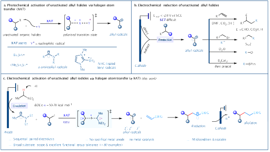 非活化烷基卤化物作为极其重要的合成中间体和烷基自由基前体,在有机合成和药物研发中有着广泛的应用,由于其多样化的结构和廉价易得性,几十年来,对于非活化烷基卤化物的活化和合成转化研究一直以来都是有机合成的热点与难点。由于非活化烷基卤化物较高的还原电位(Ered < –2 V vs SCE),从非活化烷基卤化物直接获得烷基自由基一直都是研究的难点。目前,活化策略主要分为单电子转移(SET)和卤原子转移(XAT)。单电子转移活化策略在过渡金属催化和可见光催化领域得到了广泛的研究。Fu and Peters发现激发态的Cu-亲核物种可以通过SET过程活化非活化烷基卤化物产生相应的烷基自由基。卤原子转移的策略主要在集中在可见光催化领域,发展了高效的卤原子转移试剂Bu3SnH,(Me3Si)3SiH,Leonori 发展了α-胺烷基自由基,与非活化烷基卤化物发生高效的卤原子转移(XAT)产生烷基自由基。电化学合成领域则主要利用阴极直接电还原非活化烷基卤化物的策略,通常需要牺牲阳极,使阴极具有较高的还原能力,而且反应的类型受底物的还原电位影响较大。因此,在温和的条件下直接从非活化烷基卤化物出发高效生成相应的烷基自由基仍是极具挑战性的研究课题。