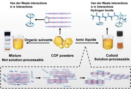 共价有机框架(COFs)作为一种结晶多孔聚合物,在气体吸附/分离、催化、生物医学、化学传感和能量存储等领域具有较大的发展潜力。在二维COFs中,共轭二维层间依靠非键相互作用(如π-π堆积和范德华力) 作用堆叠,而常见的溶剂难以破坏其层间的相互作用,导致合成的COFs通常是微米尺度的粉末。这种微米尺度的COFs粉末通常难以分散在有机溶剂中,加工性能差,严重阻碍了它们的实际应用。