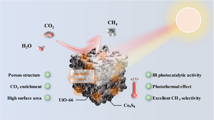 图1. UiO-66/Co9S8复合光催化剂红外光还原CO2制备CH4示意图