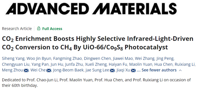 该研究成果以“CO2 Enrichment Boosts Highly Selective Infrared-Light-Driven CO2 Conversion to CH4 By UiO-66/Co9S8 Photocatalyst”为题发表在《Advanced Materials》上。a漫