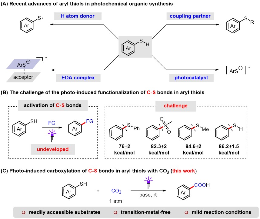 惰性C–S键的活化与转化研究对功能聚合物、复合材料和药物分子的制备以及石油炼制工业等领域具有重要作用。近年来,硫酚因其在光化学领域展现的多功能性而受到化学家的广泛关注。它们可以作为氢原子转移(HAT)试剂、偶联试剂或光催化剂,也可以通过形成电子供体-受体(EDA)复合物参与光化学过程。然而,由于硫酚及其硫酚盐C(sp2)–S键具有较高的键能,通过光化学手段实现芳基硫酚C(sp2)–S键活化目前仍是一个巨大挑战。因此,开发一种温和、高效的策略实现硫酚C(sp2)–S键的活化与转化,具有重要意义。