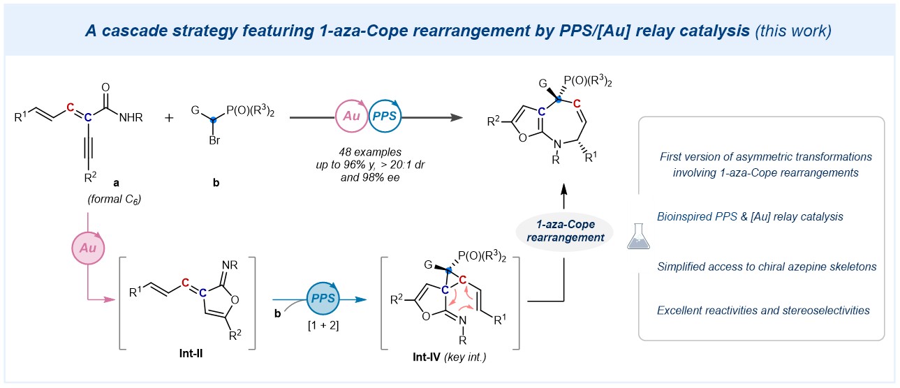 王天利教授团队通过仿生多功能手性肽季鏻盐(PPS)与金属(Au)接力催化策略,首次实现包含1-氮杂-Cope重排的不对称串联反应,该策略为精准构建结构多样的手性氮杂䓬类化合物提供了高效方法(图1)。