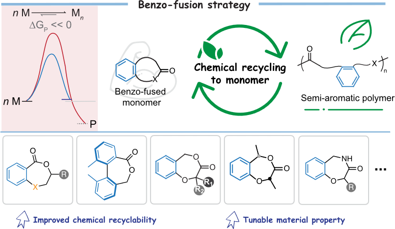 针对如上挑战,朱剑波教授团队基于苯并环状单体结构的设计,发展了一系列高性能的可循环半芳香性聚酯、聚硫酯以及聚酰胺等高分子材料。这类聚合物不仅具有优秀的化学回收能力,同时具有可调节的材料性能,可以适用于不同的应用场景,该工作详细地综述了课题关于该类聚合物的设计与合成以及聚合物结构与性能的关系,为高性能可循环聚合物的设计提供新的研究思路。