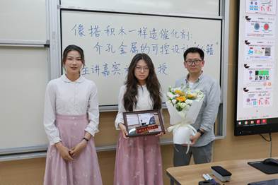 最后,学生代表向刘犇教授献花并表达敬意,全体人员合影留念,“锦水论坛”第72期“像搭积木一样造催化剂:介孔金属的可控设计‘秘籍’”讲座圆满结束。